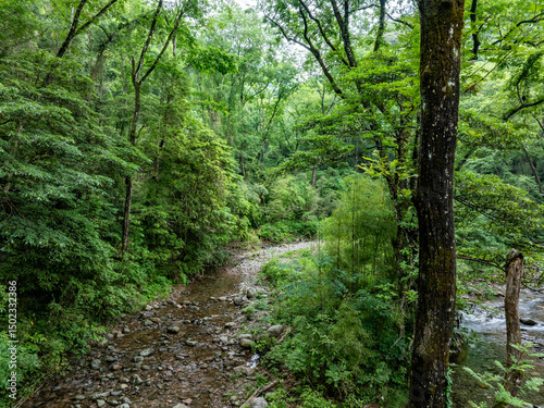 © hrui, Obraz premium Green forest stream overlooking