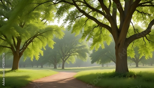 © Faisal, Naklejka premium Green Forest Sun Sky Pine Bamboo Trees Jungle Canopy Background Summer Spring Autmn Camping Travel