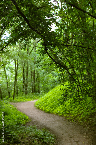 © vita, Fototapeta premium Green forest winding path. A curve footpath in a dark park, deep woods in summer