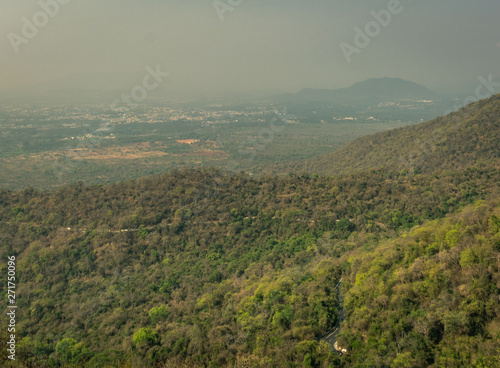 © explorewithinfo, Naklejka premium Green forest with road in the middle