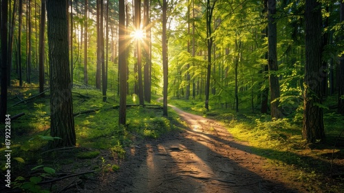 Obraz premium Green forest with tall trees, a winding path, sunlight filtering through the leaves