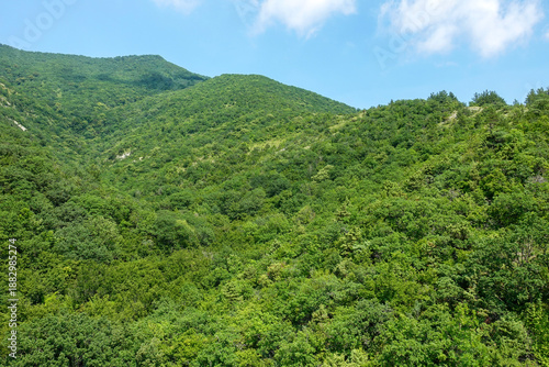 © Katyam1983, Fototapeta premium Green forested mountain hills under clear summer sky