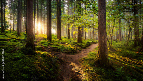 © Delly, Fototapeta premium Green forests, towering trees, and winding trails.