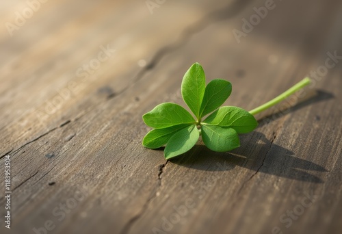 Naklejka premium Green four-leaf clover on a sunlit wooden surface