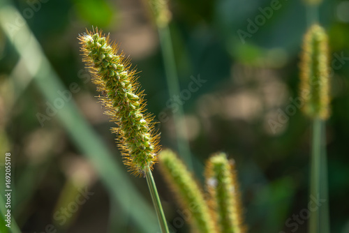 © Oleh Marchak, Fototapeta premium Green Foxtail Setaria viridis growing in a sunny field during late summer with vibrant green background and distinct spikelets