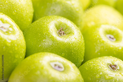 Obraz premium Green fresh apples close up, selective focus.
