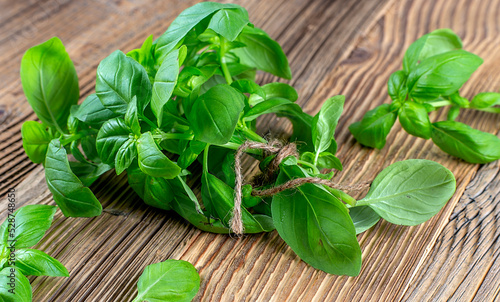 Fototapeta premium Green fresh basil on a wooden background