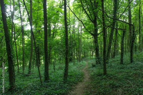 Naklejka premium Green fresh leaves tree trunk tunnel with way road into forest ecology organic vegan concept