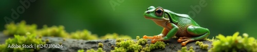 Naklejka premium Green frog on a mossy rock, eyes fixed on something unseen , mystery, moss,...