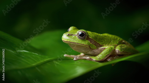 Naklejka premium Green Frog on Vibrant Green Leaf: Studio Lighting Photography