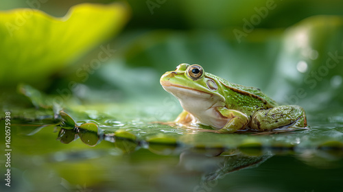 Fototapeta premium Green frog perched on a lotus leaf floating in a calm pond, its eyes alert as...