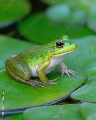 Naklejka premium Green Frog Resting on a Lilypad in a Tranquil Pond Surrounded by Lush Vegetation