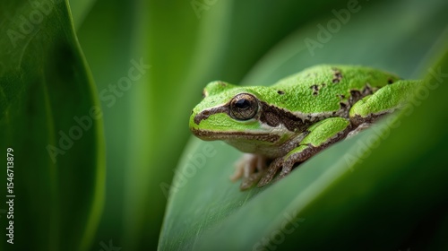© Nonnarit, Naklejka premium Green Frog Resting on Leaf Surrounded by Lush Green Foliage