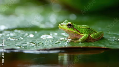 Naklejka premium Green frog sits on a broad leaf covered in droplets, reflected in nearby water