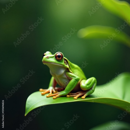 © Prayad, Naklejka premium Green frog sitting on a leaf in the forest , green frog, fun, nature