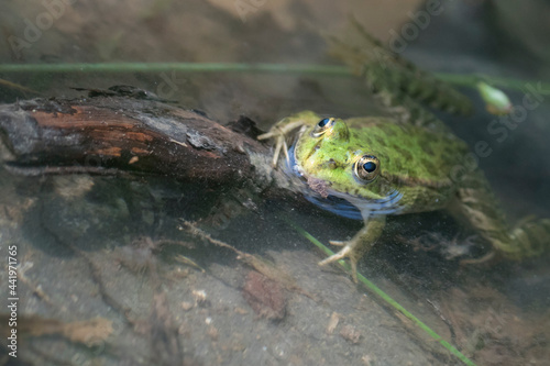 © nihat boy, Fototapeta premium Green frog standing above water, space for text