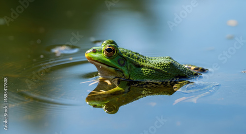© Nur, Fototapeta premium Green Frog Swimming in Calm Water with Reflection.