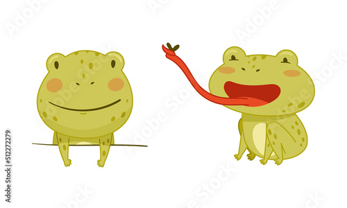 Obraz premium Green funny frog characters set. Cute toad amphibian animal catching fly with...