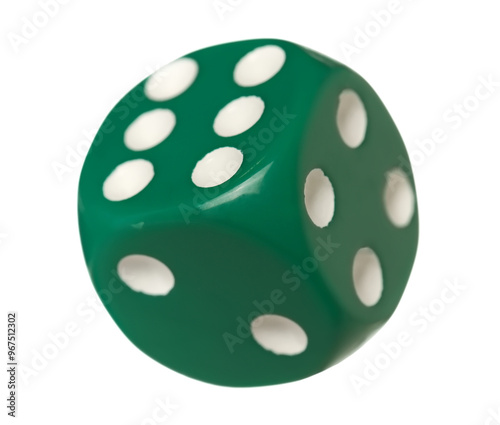 © dule964, Fototapeta premium Green gambling dice flying, macro isolated on white background, clipping path