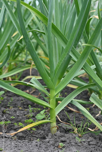 Obraz premium green garlic stalks growing on chernozem, garlic stalks growing in rows