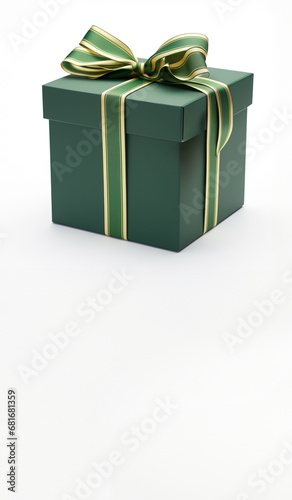 Obraz premium Green gift box - green and gold ribbon - white background - copy space below