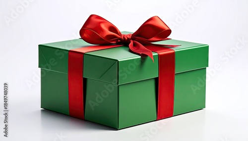 © WAFELLO, Fototapeta premium Green gift box with red ribbon and bow for surprise present.