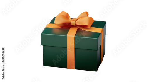 © Aoun, Obraz premium Green Gift Box Wrapped with Orange Ribbon and Decorative Bow Isolated on White Background