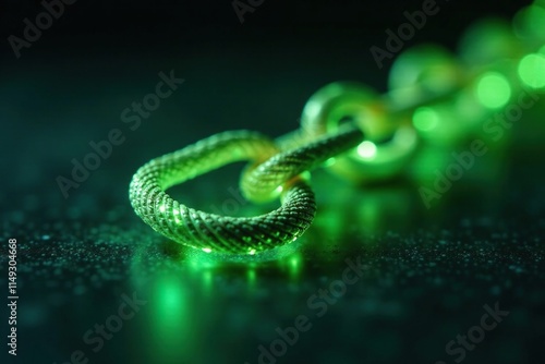 Fototapeta premium Green glowing gold chain links on dark surface with reflection, glow in the...