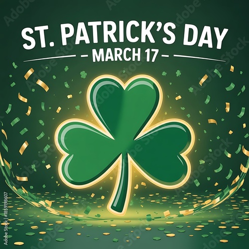 © Naiem, Obraz premium Green glowing shamrock with confetti for St Patricks Day celebration