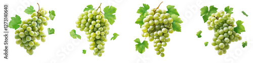 © Food and drink, Obraz premium Green grape clusters and leaves flying mid-air, isolate on white background. Mix collection cutout png.
