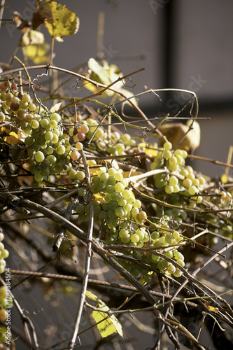 © Cavan, Fototapeta premium Green Grapes Cluster on Dry Autumn Vines in Golden Sunlight
