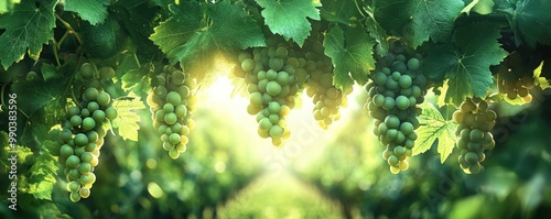 © Lexyat, Naklejka premium Green grapes hanging from a vine, sunlight shining through leaves.