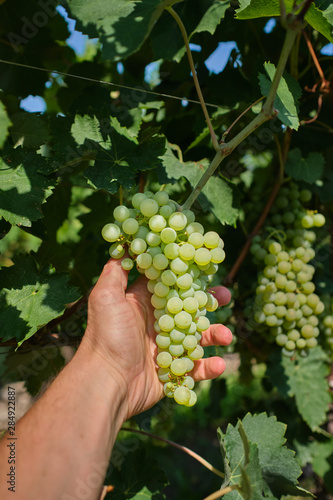 © Berg, Obraz premium Green grapes on the bush, grape harvest, bunch of grapes in the hand.