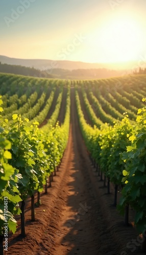 © Maryna, Fototapeta premium Green grapevines grow in long neat rows across vast vineyard farm. Golden sun illuminates cultivated land, distant hills during peaceful morning. Picturesque agri landscape shows healthy plants ready