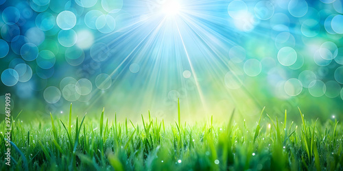 Obraz premium Green grass and blue bokeh background with sun rays shining through, creating...