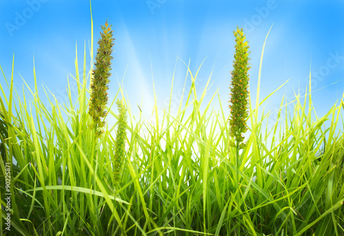 © ooddysmile, Fototapeta premium Green grass and blue sky background