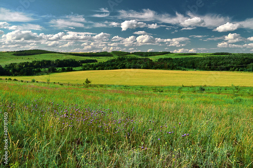 Fototapeta premium Green grass and wheat field on small hills and blue sky with clouds