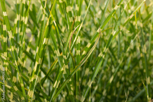 © Olena, Fototapeta premium Green grass background. Grass Miscanthus Strictus close-up.