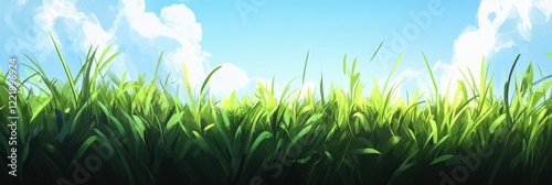 © Ps, Obraz premium Green grass blades growing under blue sky and white clouds