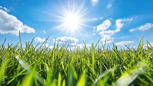 Fototapeta premium Green Grass Blades Under Blue Sky With Sunburst