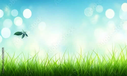 Fototapeta premium Green grass, blue sky, spring blurred bokeh background