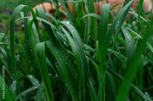Obraz premium Green grass close-up with raindrops. Big dog sleeping behind the grass,...