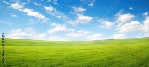 Fototapeta premium Green grass field agains the blue cloud sky, Generative AI