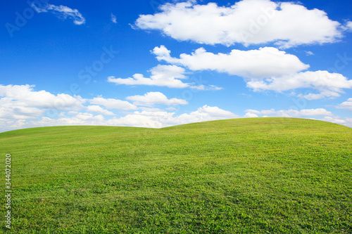 Fototapeta premium Green grass field and blue sky with clouds