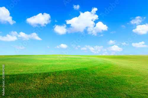 Fototapeta premium Green grass field and blue sky with white clouds.