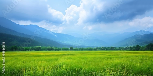 © duyina1990, Fototapeta premium Green Grass Field Landscape with Mountain Range in the Background