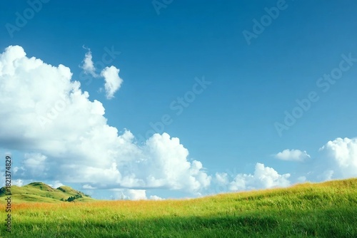 © SEUNGJIN, Fototapeta premium Green grass field on small hills and blue sky with clouds.