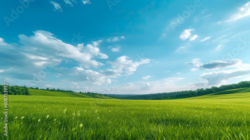 Obraz premium Green grass field on small hills and blue sky with clouds, Generative AI