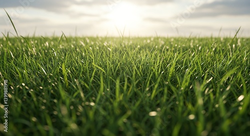 © ryandi, Fototapeta premium Green Grass Field Under Sky with Sun Shining Through Clouds