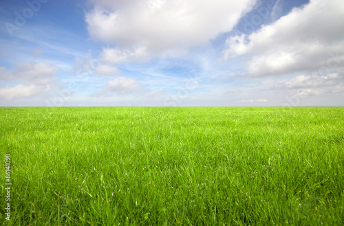 Fototapeta premium Green grass field with bright blue sky